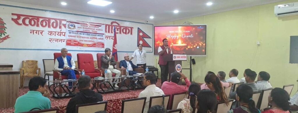 रत्ननगर । रत्ननगर नगरपालिका सार्वजनिक सेवा प्रवाह तथा क्षमता विकास समितिको आयोजनामा शुभदीपावली, छठपर्व तथा नेपाल सम्वतको अवसरमा जनप्रतिनिधि र कर्मचारीबीच शुभकामना आदानप्रदान तथा अन्तरसंवाद कार्यक्रम सम्पन्न भएको छ ।
